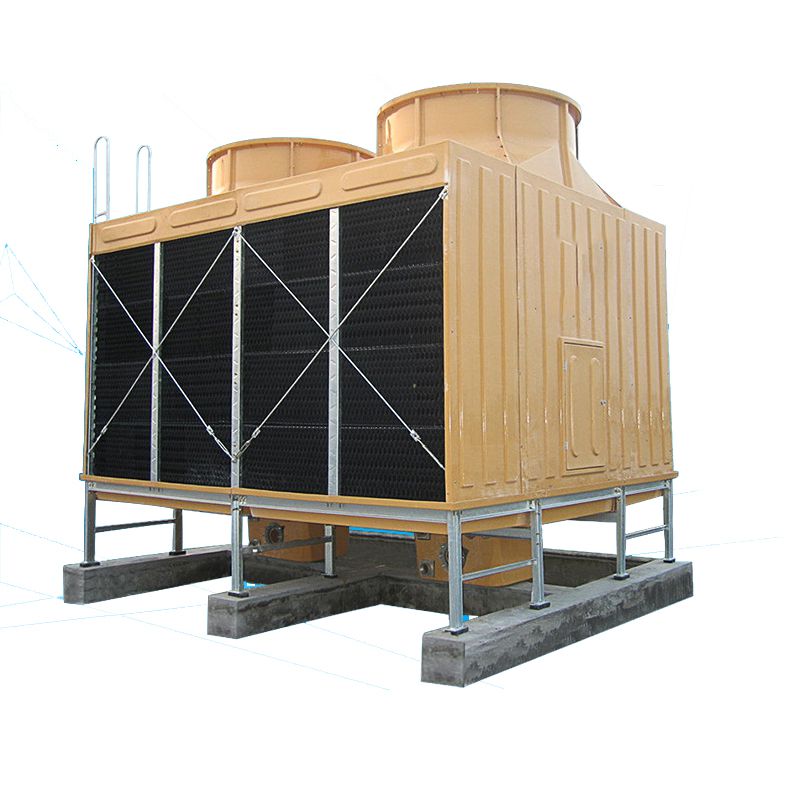 方形橫流式玻璃鋼冷卻塔采用兩側(cè)進風(fēng),靠頂部的風(fēng)機,使空氣經(jīng)由塔兩側(cè)的填料,與熱水進行介質(zhì)交換,濕熱空氣再排向塔外。填料采用兩面有凸點的點波片,通過安裝頭使點波片粘結(jié)成整體,以提高剛性,兩面的凸點還可避免直接滴水,因此提高了水膜形成能力,填料尾部設(shè)有收水措施。